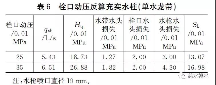 以修正后的公式,按規范規定的栓口動(dòng)壓反算充實(shí)水柱,分單水龍帶和雙水龍帶串接2種情況,計算結果見(jiàn)表6、表7。