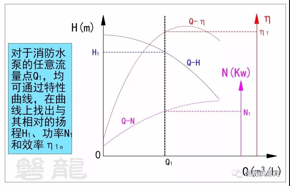二、對于消防水泵的任意流量點(diǎn),均可通過(guò)特性曲線(xiàn),在曲線(xiàn)上找出與其相對的揚程、功率和效率。