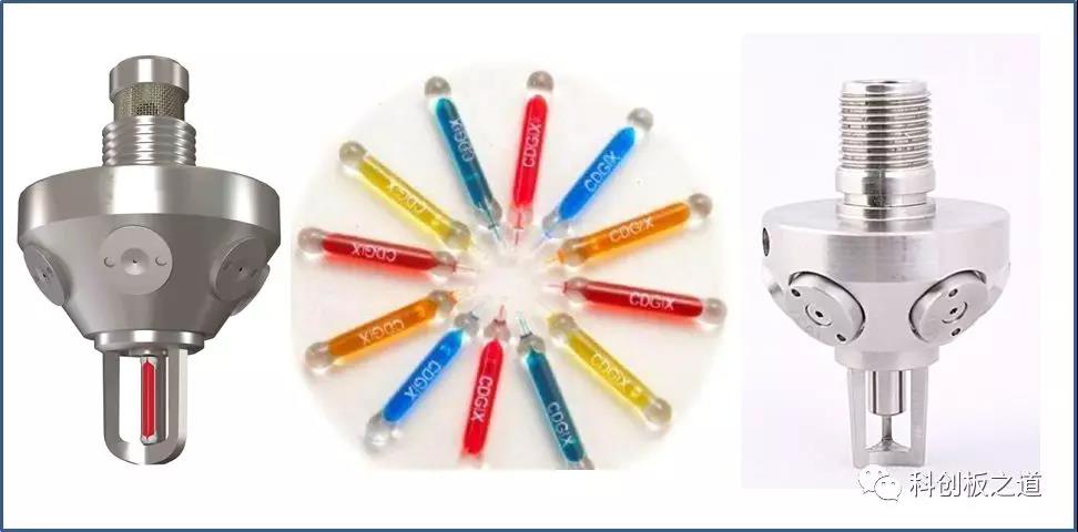 【左邊為閉式噴頭,右邊為開(kāi)始噴頭,中間為感溫玻璃球】
